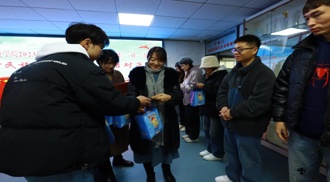 见面会伊始,由员工代表公布了少数民族同学和对应帮扶人员的结对名单,借此机会,研会成员与其帮扶的少数民族同学面对面加强了沟通交流,拉近了彼此之间的距离,建立了彼此间的友情。随后陈琴副部长、曾庆欢副部长和李岚书记向现场的同学们表示关怀,勉励在场的各位同学要团结向上,互帮互助,共同进步。最后各位领导、老师们为同学们送上了冬日关怀礼盒,预祝同学们新年快乐!