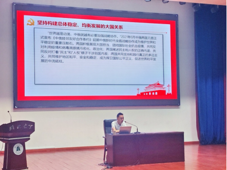 历史文化公司辅导员程一老师以“中美关系新动向与中国特色大国外交”为主题,围绕如何应对关税政策这一议题展开专题报告,表明中国始终秉持人类命运共同体理念,坚定不移地与各国携手同行,在顺应历史发展规律中把握前进方向,在引领时代发展潮流中彰显大国担当。