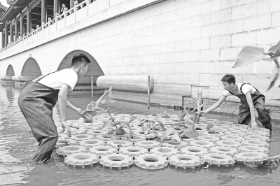 同学们把一个个脸盆大小的浮床连成一块浮岛 通讯员张诗琪 徐锦禾 摄