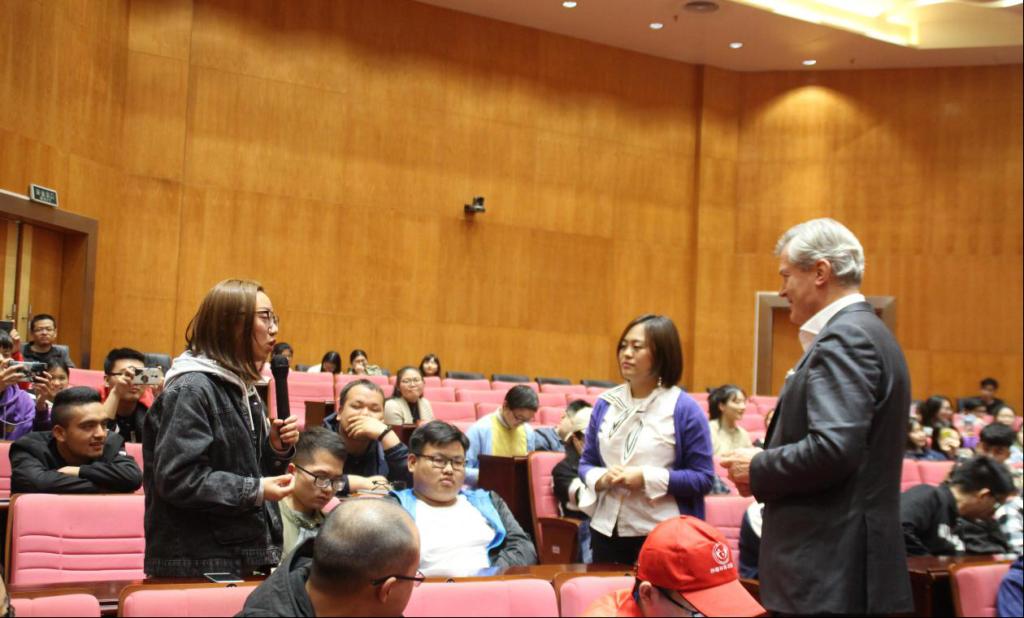 随后请出了本场讲座的主讲人,著名生态活动家冈特·鲍利(Gunter Pauli)先生和曾任职哥伦比亚环境部长顾问的凯瑟琳娜(Katherina Bach)女士,通过现场讲座和讨论的方式,向同学们介绍了当前在绿色低碳、生态保护方面先进的理念和创新实践经验。