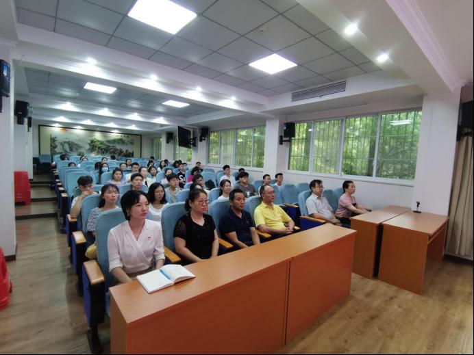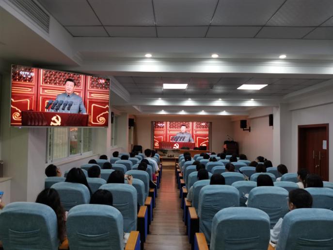 公司在1楼会议室组织师生党员集中观看大会直播