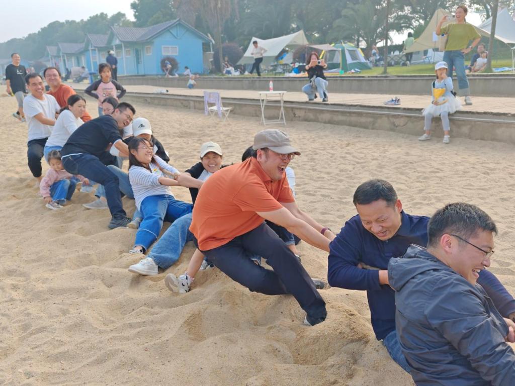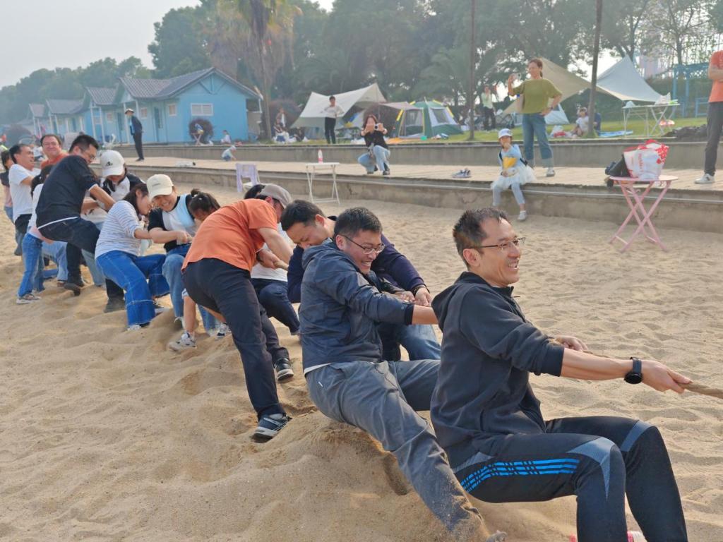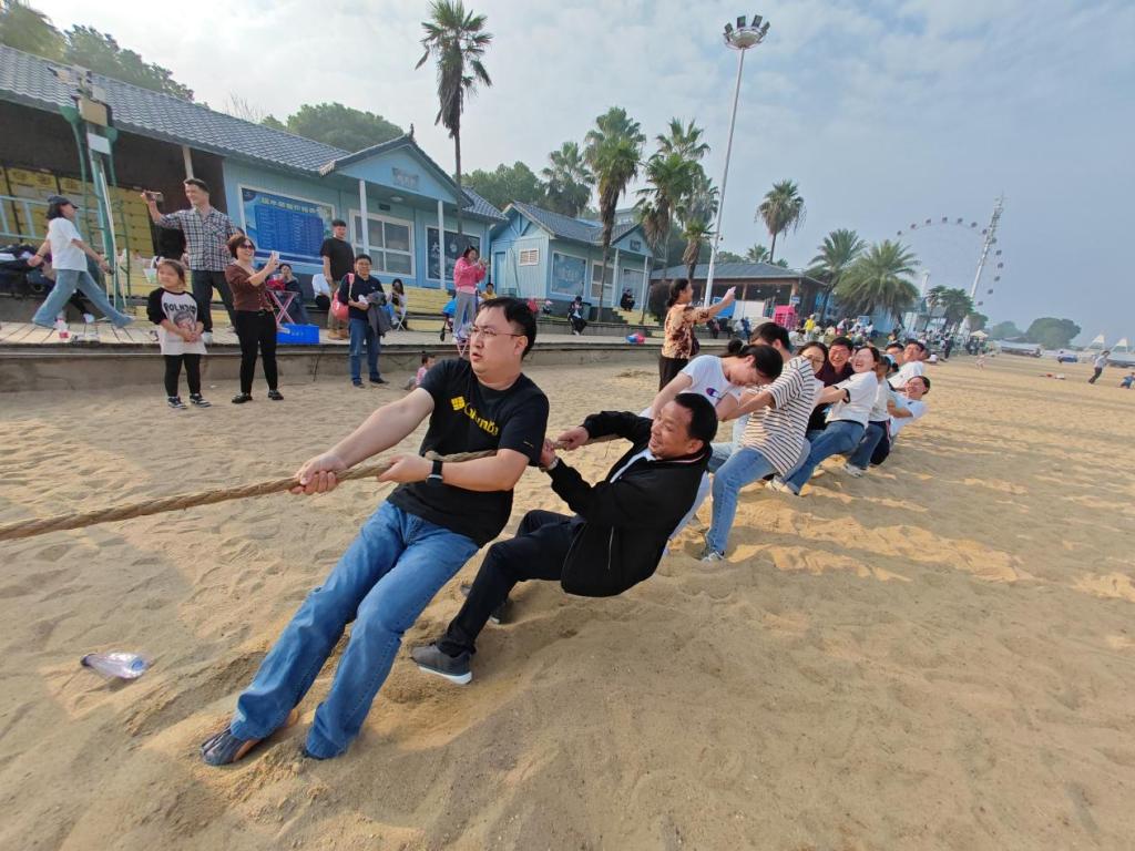 在湖面,教职工们体验了脚踏船的舒适、惬意。在沙滩浴场,教职工们按不同学科组队,进行了一场激动人心的拔河比赛。比赛中,老师们都咬紧牙关,倾尽全力,坚定信心,每一个人都充满力量与激情,每一次用力都让人热血沸腾,充分展现了团队合作的重要意义。