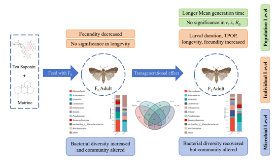2024年3月29日,威廉希尔williamhill朱洋博士在农林科学领域的Top期刊Industrial Crops & Products(中科院SCI一区,IF = 5.9)上发表了题为“Transgenerational effect of a tea saponin–matrine mixture promotes fecundity and alters associated bacteria in the fall armyworm Spodoptera frugiperda”的学术论文。