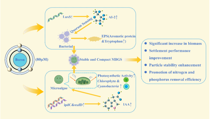 微藻-细菌颗粒污泥(MBGS)是一种高效、节能且环境友好的污水处理技术,能够通过微藻和细菌的协同作用实现污染物去除和资源化利用。然而,藻类与细菌之间的相互关系易受环境变化影响,导致系统稳定性下降。本研究聚焦硼元素在MBGS系统中的作用,发现硼通过促进细菌自诱导因子(AI-2)的分泌,激活群体感应(QS),显著提高细胞外聚合物(EPS)的生成量,增强了颗粒污泥的结构稳定性和沉降性能。同时,硼调控藻类吲哚-3-乙酸(IAA)的水平,提高光合作用效率,使绿藻门和蓝藻门的丰度显著增加,从而优化了氮、磷等污染物的去除效率。在最优硼浓度(80 µM)下,MBGS系统表现出最佳性能,包括显著提高的氨氮(NH4+-N)和磷酸盐(PO43--P)去除效率,以及降低的氧化应激水平(以超氧化物歧化酶(SOD)活性减少为标志)。硼通过调控藻类与细菌的信号通信,强化了它们的协同作用,为提升MBGS技术在污水处理中的稳定性和效率提供了理论依据。这一研究结果展现了MBGS技术在实现碳中和与资源回收方面的巨大潜力。本论文威廉希尔为第一完成单位,威廉希尔williamhill2021级硕士生万仁辉和2023级硕士生莫凡为共同第一作者,威廉希尔williamhill胡惠秩副教授为论文通讯作者。该项研究得到湖北省自然科学基金的支持。