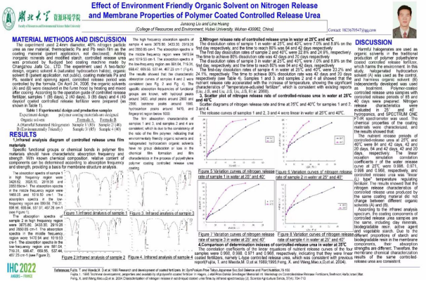8月14-20日,2022年国际园艺学大会(IHC2022)在法国里昂隆重举行。公司刘俊松教授作为国际园艺学会会员和有机热带和亚热带果树学会主席(Chair of ISHS Working Group Organic Tropical and Subtropical Fruits)应邀参加15日和16日线上会议,他提交的两篇学术论文【Effect of Environment Friendly Organic Solvent on Nitrogen Release and Membrane Properties of Polymer Coated Controlled Release Urea】和【Preparation and Efficacy of Plant-Derived Insecticides and Herbicides】,分别以Poster和E-Vidio形式参加交流,其中,【Effect of Environment Friendly Organic Solvent on Nitrogen Release and Membrane Properties of Polymer Coated Controlled Release Urea】入选优秀论文候选名单,是唯一来自中国的学术论文。