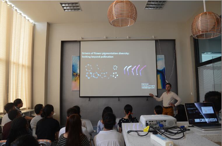 8月5日上午,Laura Galloway教授在公司工会活动室开展了题为“Interactions between Drift and Selection in the Evolution of Plant Reproduction”的学术报告。Galloway教授首先就长时间尺度上植物从最适生态位往周边扩散过程中遇到的生态限制(pollinator),进化限制(bottleneck)和随机因素(drift)进行了详细的阐述,这些因素往往会导致植物的不同居群随着扩散线路产生繁殖方面的响应。后通过调查草本植物美洲风铃草现存分布范围内的20余个居群,发现其确实存在沿扩散线路方向的主动自交水平的提升。Galloway教授团队通过多种野外和控制实验否定了生态因素,肯定了遗传漂变在种群扩散过程中对繁殖的影响。同日,Matthew Koski博士也进行了一场学术报告,题目为“The Ecological Drivers of Floral Pigmentation Diversity: Looking beyond Pollinators”。该报告从画面上就十分吸引人,花朵的各种颜色五彩缤纷,绚丽多姿。Koski博士从图像入手为大家生动的讲解了花朵和花内器官的可见光和UV图案的多样性和各种可能的进化推手;而后用三个独立的实验研究为师生们揭开了美丽多变的花朵背后的真相,即它们更大程度上受物理因素温度和光照影响,人类可见的颜色变化只不过是植物为抵御强光和高温产生化合物的副产品。