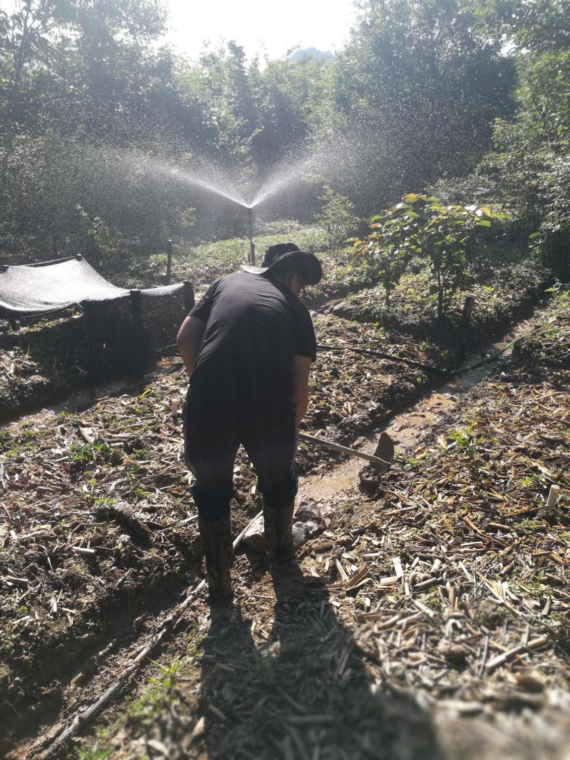 次日团队成员根据实验基地泥炭藓生长的情况,通过人工建造管道对试验田进行水位调控,结合神农架特殊的气候和泥炭藓生长的习性,在一些不同的地块进行遮阳网覆盖,采取不同梯度的遮阴和水位指标,通过对生态因子的调控,以便得出泥炭藓生长的最优条件,从而实现亚热带高山泥炭藓的恢复。