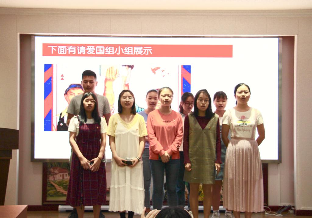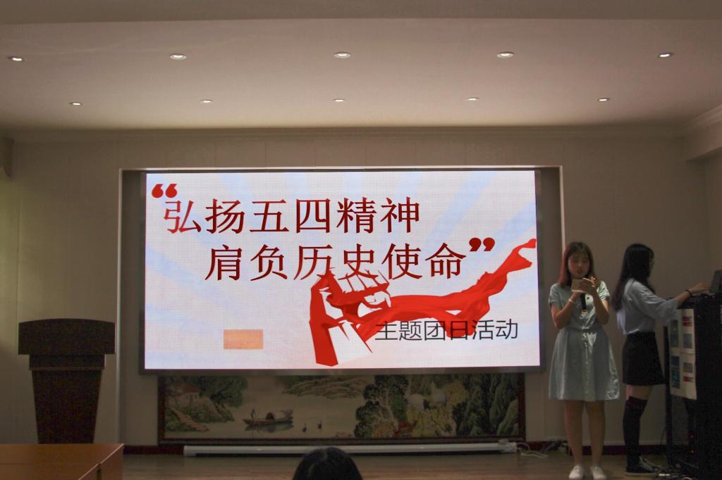活动现场,一段有关“百年五四”的视频拉开了本次团日活动的序幕。组织委员李芸带领同学们观看了视频并向大家讲解了五四青年节的光辉历史和重要意义。随后全体同学按五四青年节的核心内容“爱国、进步、科学、民主“分成了四个小组进行小组展示。