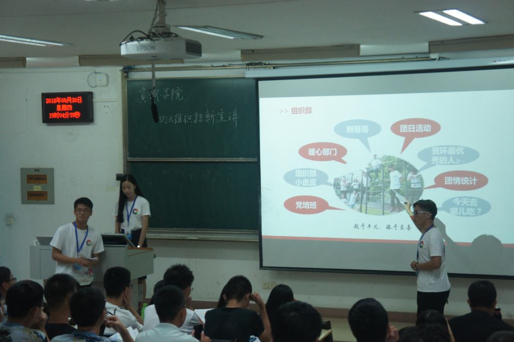 拉开宣讲会帷幕的是共青团威廉希尔williamhill委员会。来自宣传部的高雪源同学和来自组织部的闫华涛同学用精彩的配合,将现场气氛带入高潮。他们不仅全面介绍了团委台前幕后的员工工作,也与同学们分享了团委工作中点点滴滴的快乐与感动。