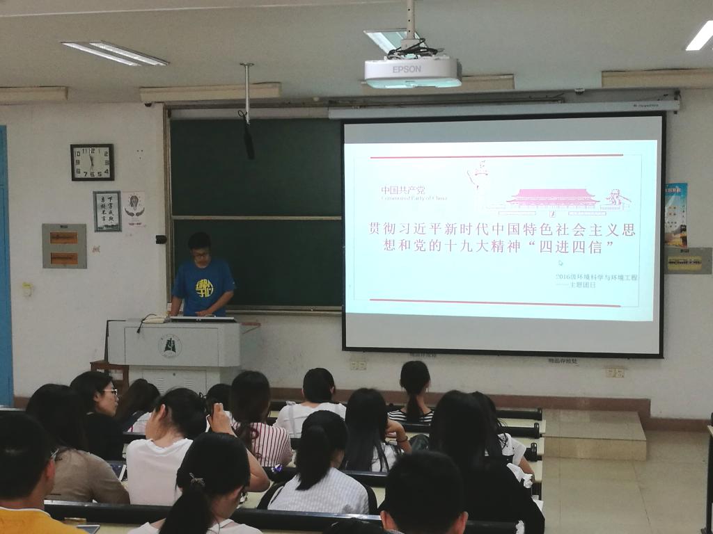 在2016级环境工程专业的主题团日活动上,团支部书记林基桢与大家共同学习了习近平新时代中国特色社会主义思想。讲到习近平新时代中国特色社会主义思想的伟大作用时,林基桢说:“习近平新时代中国特色社会主义思想作为马克思主义中国化最新成果,为开启全面建设社会主义现代化国家新征程指明了方向,为应对新时代发展面临的风险挑战提供了科学方法,为应对全球挑战、解决人类问题提供了全新选择。”之后,林基桢向同学们宣传了“四进四信”的深远意义。