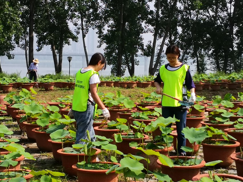 早上七点五十,志愿者们在公司门口集合并清点好人数后出发。到达护荷基地后,志愿者万仁辉依据人数分发手套、志愿服。这次活动中,志愿者们吸取上次的经验教训,放弃了低效伤手的铁锹,而选用手套作为除草工具。因人数足够,活动改由每人负责一排荷花,除去其周边杂草。草长得很杂且密,劳动量很大,但并未有人因此而抱怨。