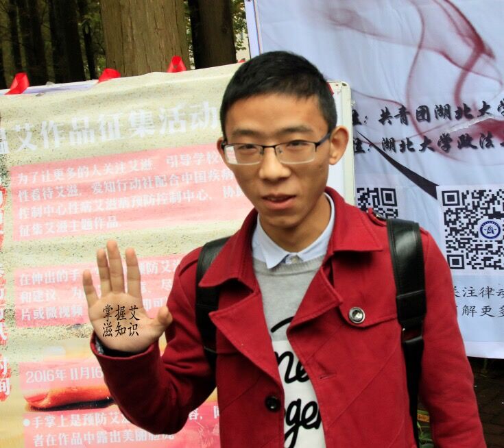 本次活动主要以邀请来往同学们在装饰有红丝带、大海报的站牌前举起手拍照,并实名登记的形式展开。回馈给参与者的是黄鹤楼纪念册和明信片等小礼品。据了解,所有征集到的照片都将用于艾滋预防宣传,另外,社团将参与者的照片妥善保管,确保同学们的个人信息不泄露。短短的两个多小时,爱知行动社已邀请近40位同学留下了爱心的照片。