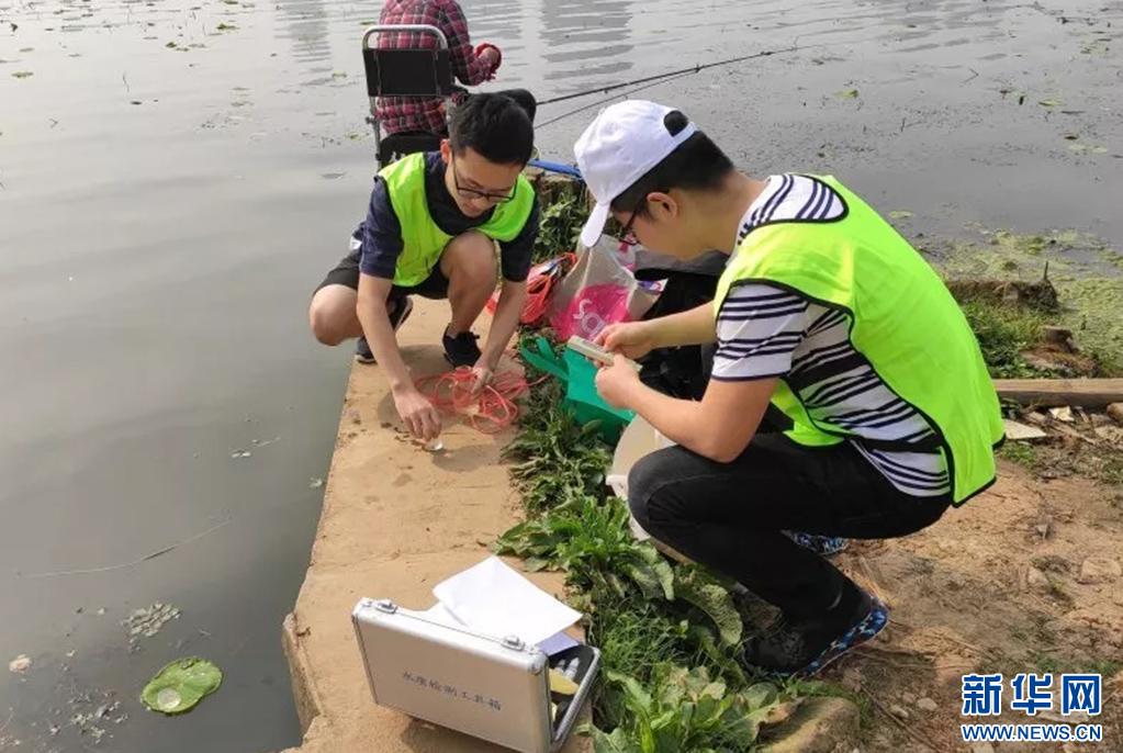 图为威廉希尔沙湖环保志愿队的队员进行水质取样。新华网发