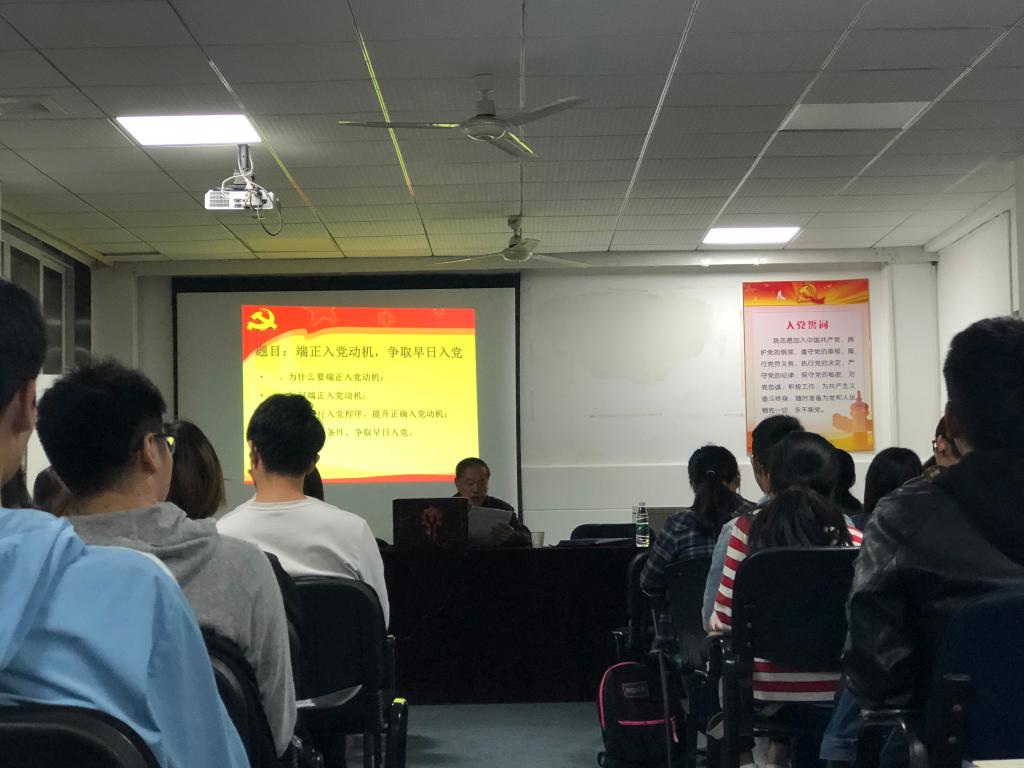 接着,彭老师讲述了“如何端正入党动机”。一是通过学习理论,树立正确的入党动机。二是通过正确的入党动机转变不正确的入党动机。他说道:“组织上入党是一时的事,思想上入党是一辈子的事。”