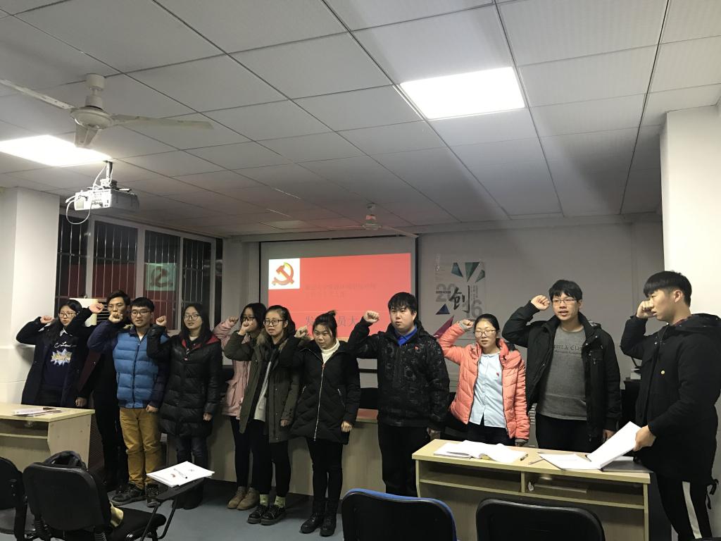 秩序井然,气氛庄严肃穆。在对被发展的同志进行充分讨论的过程中,同班同学的评价起到了非常重要的作用,通过描述被发展对象平日生活里的一件件小事,支部成员看到了他们不为人知的优秀的一面。最后,所有新晋预备党员上台,由正式党员为他们佩戴党员徽章,在支部书记带领下,进行了庄严的宣誓。