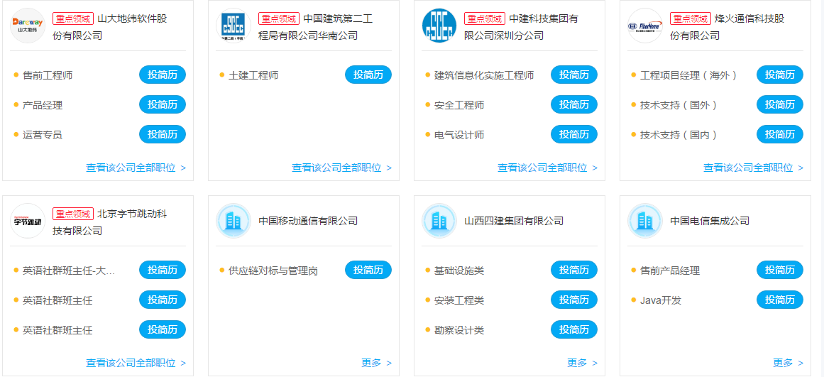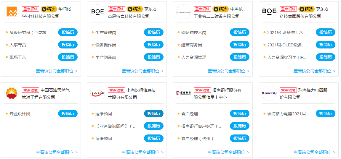 为贯彻落实党中央、国务院“稳就业”“保就业”决策部署和2021年全国两会精神,促进高校毕业生与国有大中型企业人才供需对接,教育部、国务院国资委决定举办“全国大中型企业面向2021届高校毕业生网上双选月。该活动举办时间为2021年5月13至2021年6月13日。 部分企业截图如下: 全国大中型企业网址链接:https://job.ncss.cn/student/jobfair/fairdetails.html?fairId=KuaeUQtexhx27idjn7XBHX