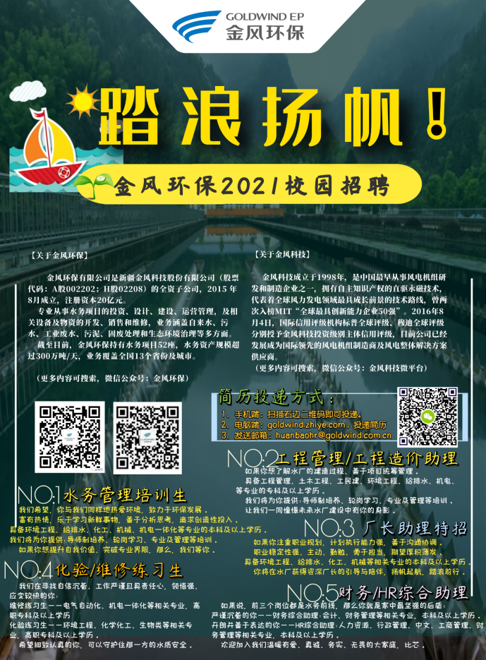 金风环保有限公司2021年校园招聘会 面向专业:环境工程、给排水、工程、电气、化工(催化剂)、财务相关、人力相关等专业。数量:每年招聘大专及以上学历的20名应届生。其他:毕业前可报名实习,但时间不少于1个月。工作地点:湖北省内:武汉、安陆、广水、荆州、利川、江西抚州、福建宁化、漳州、湖北澧县。其他省市:北京、山东、江苏、浙江、贵州、云南、新疆、陕西、安徽等。